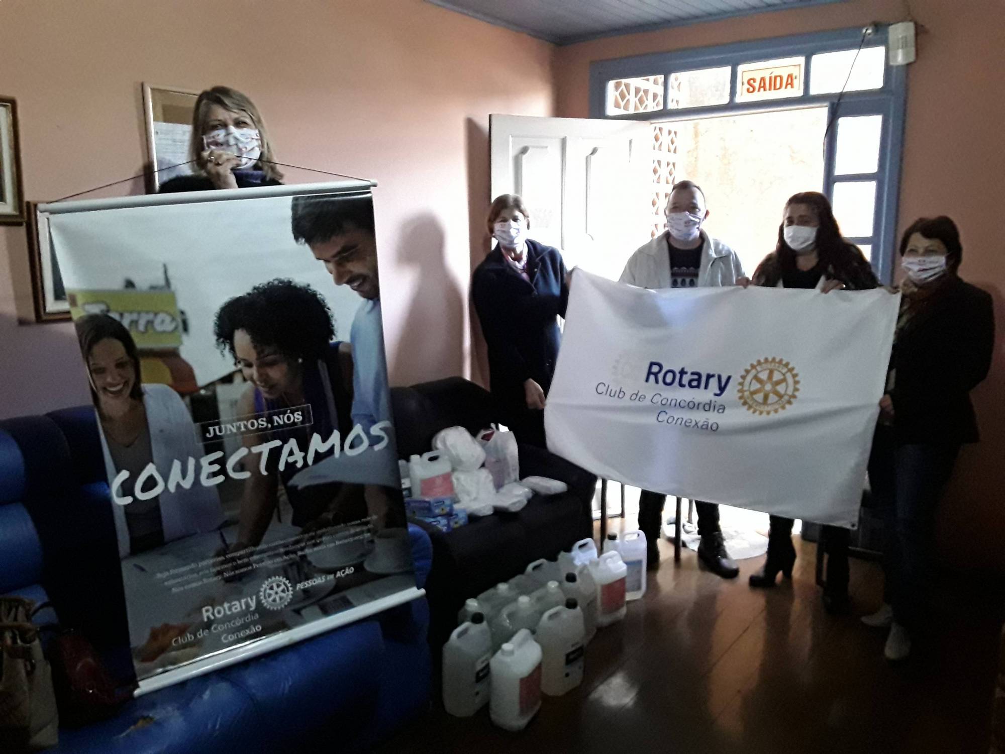 Manhã de outono em Concórdia, uma bruma teima ainda esconder a Capitlal do Trabalho, mas o pessoal do Rotary Club Concórdia Conexão não para. Agora, a mais nova atitude cidadã do time foi de entregar kits com materiais necessários para o combate à pandemia. A Ong Mão Solidária, que trabalha, de forma albergada, com pessoas sem teto que vagam de cidade para cidade foi a agraciada. Representado no ato pelo presidente Agostinho Schiochetti e as companheiras Maria Demarchi, Marisa Foscarini, Sirlei Bolsi iluminaram o dia da entidade, que é uma das mais carentes do nosso município. Lá, foi deixado um kit com máscaras, álcool gel, luvas, toucas, sabonete liquido, desinfetante, máscaras.