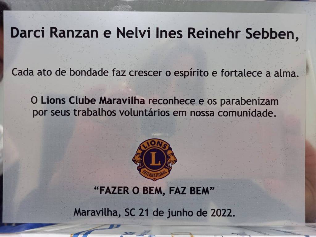 Nosso Vice-Presidente Companheiro Darci Ranzan e esposa Companheira Nelvi, compartilharam a homenagem recebida do Lions Maravilha. Um reconhecimento pelos trabalhos voluntários em nossa comunidade.