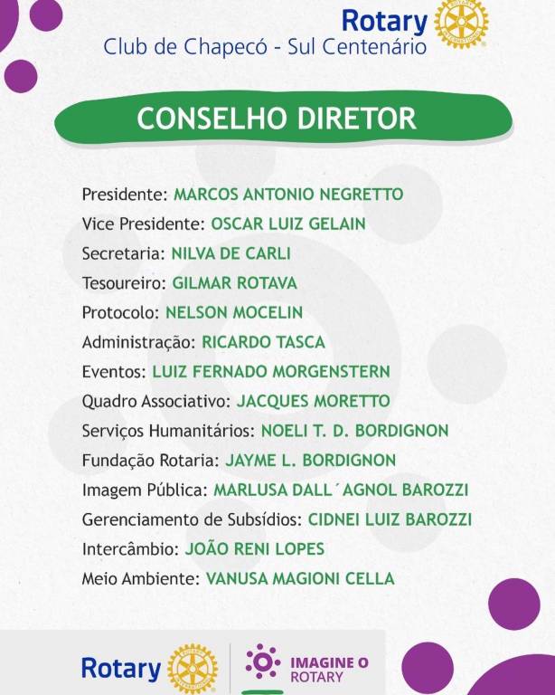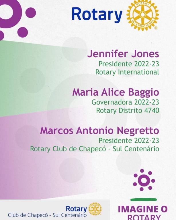 Na última segunda-feria(11.07), ocorreu a cerimônia festiva de posse do novo conselho diretor e a transmissão do cargo da presidência para o novo ano rotário. A presidente do período 2021/2022 Carina Braun transmitiu seu cargo para o novo presidente Marcos Negretto, que assume a nova gestão sob o lema presidencial " Imagine o Rotary".