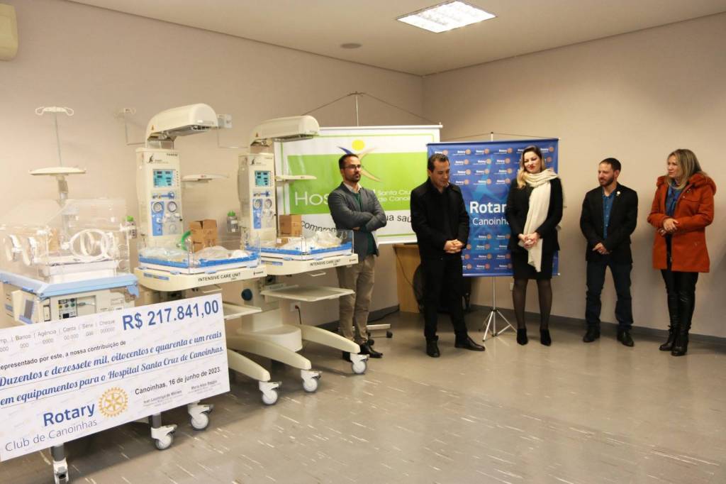 No dia 16 de junho de 2023, com enorme orgulho e satisfação o Rotary Club de Canoinhas fez a entrega de novos equipamentos para a UTI Neonatal do Hospital Santa Cruz de Canoinhas. Esses equipamentos foram adquiridos e doados ao hospital, através de projeto de Subsídio Global desenvolvido pelo Rotary Club de Canoinhas, em parceria com o Hospital Santa Cruz e subsidiado pela Fundação Rotária. O evento de entrega contou com a participação da governadora Maria Alice Baggio, do governador Ivan Gilioli e sua esposa, do presidente do RC de Canoinhas Ivan de Moraes, do presidente do hospital Sr. Reinaldo Lima, da Diretora do Hospital Karin Adur, companheiros do RC de Canoinhas e médicos e funcionários do Hospital.