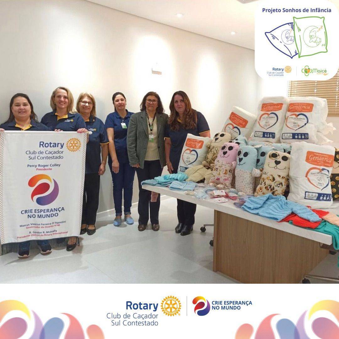 No dia 31/08/23 estivemos presentes no hospital Maicé de Caçador, onde fizemos a doação de naninhas (Projeto Sonhos de Infância), meias para recém nascidos (Projeto Pés Quentes) e fraldas geriátricas (Projeto Cuidar com Qualidade). Na ocasião, também fizemos a doação de casacos para recém nascidos confeccionados pela voluntária e sócia honorária Belézia D`Agostini Faoro.