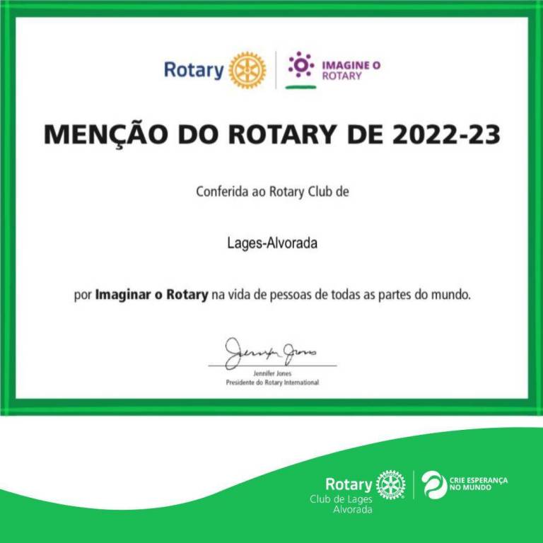 O Rotary Club de Lages Alvorada, recebeu a Menção do Rotary Internacional, pelo reconhecimento do cumprimento das metas durante o Ano Rotário 2022-23, gestão do Presidente Ilton Agostini Júnior.