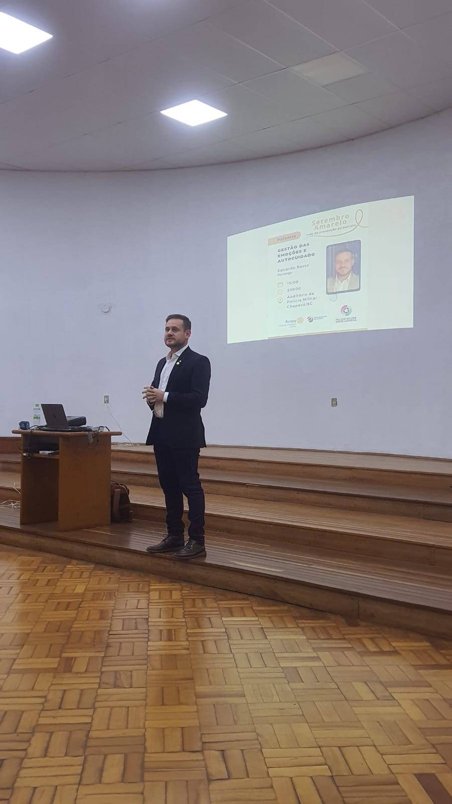 Em alusão ao Setembro Amarelo, mês de prevenção ao suicídio, o Rotary Club de Chapecó-Centro juntamente com a Polícia Militar de Santa Catarina, promoveu no dia 15 de setembro a palestra Gestão das Emoções e Autocuidado, ministrada pelo nosso companheiro, psicólogo Eduardo Basso. Além das questões quanto à prevenção ao suicídio, foi abordado principalmente sobre o valor da vida, como gerenciar as emoções e a ter o autocuidado, a fim de evitar sentimentos negativos.
