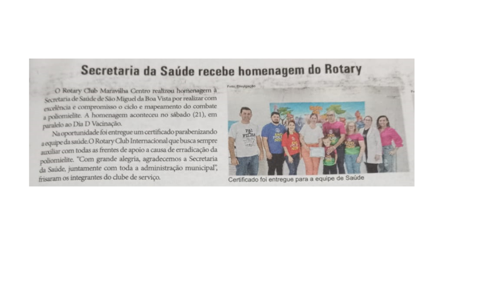 O Rotary Club de Maravilha-Centro providenciou a confecção e entregou uma pastinha fliptop, através da coordenadora da pasta End Polio Now, companheira Eliane Schossler, para que os pais possam guardar a caderneta de vacinação de seus filhos de forma segura e protegida. Nesse mesmo dia foi entregue à Secretaria de Saúde de São Miguel Da Boa Vista um certificado de reconhecimento, pois a vacinação contra a Pólio naquele município já havia atendido 100% do público-alvo.