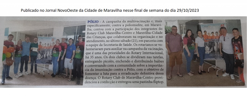 A campanha da multivacinação e, mais especificamente, contra a poliomielite, em Maravilha, contou com a participação dos integrantes dos Rotary Clubs Maravilha-Centro e Maravilha-Cidade das Crianças, que colaboraram na organização e no atendimento, neste último sábado, dia 21, em parceria com a equipe da Secretaria de Saúde de Maravilha.
