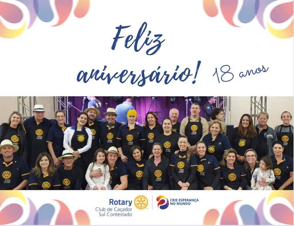 Parabéns, Rotary Club Caçador Sul Contestado pelos seus 18 anos de existência. Que essa data seja celebrada com alegria, gratidão e esperança. Que possamos olhar para trás com orgulho e para frente com entusiasmo. Que possamos continuar a ser a mudança que queremos ver no mundo.