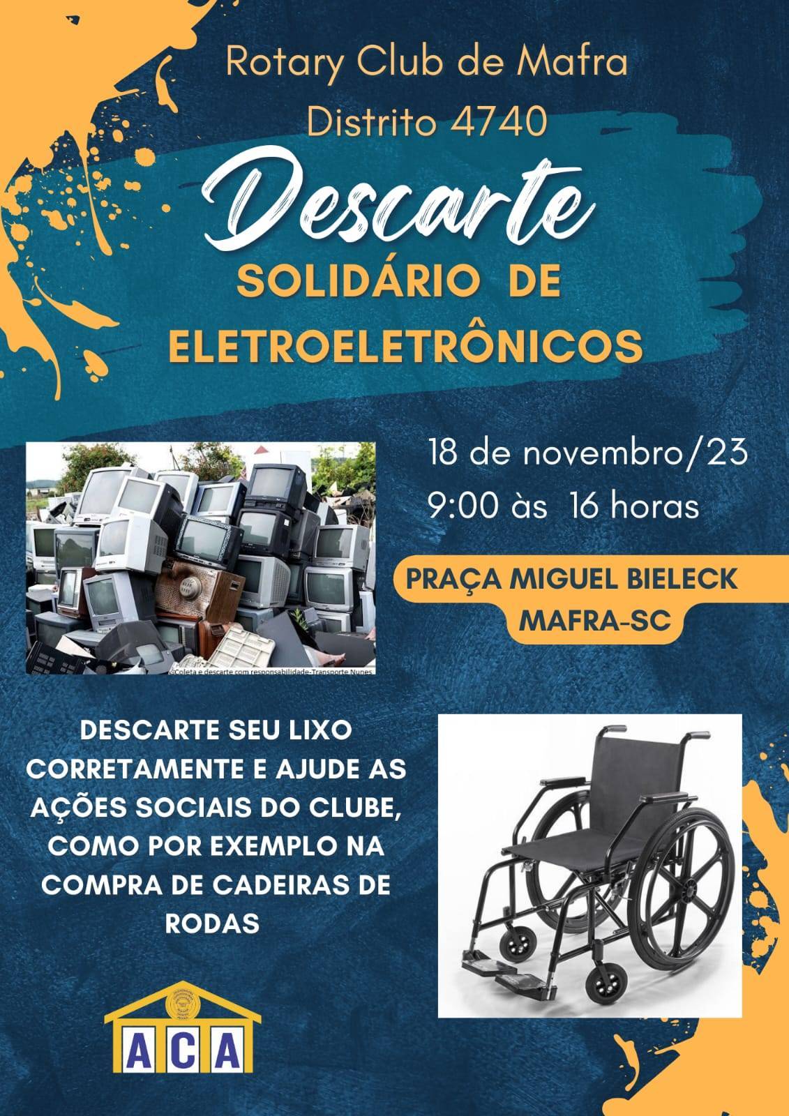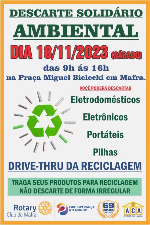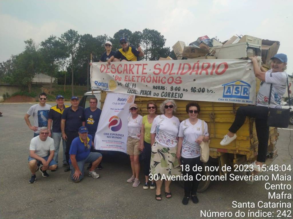 Visando fazer a correta destinação e reciclagem dos equipamentos eletroeletrônicos o Rotary Club e a Casa da Amizade de Mafra em parceria com a empresa EVL Reciclagem e Sustentabilidade promoveram no sábado, dia 18/11/2023 um "drive thru" para coleta destes reciclaveis.