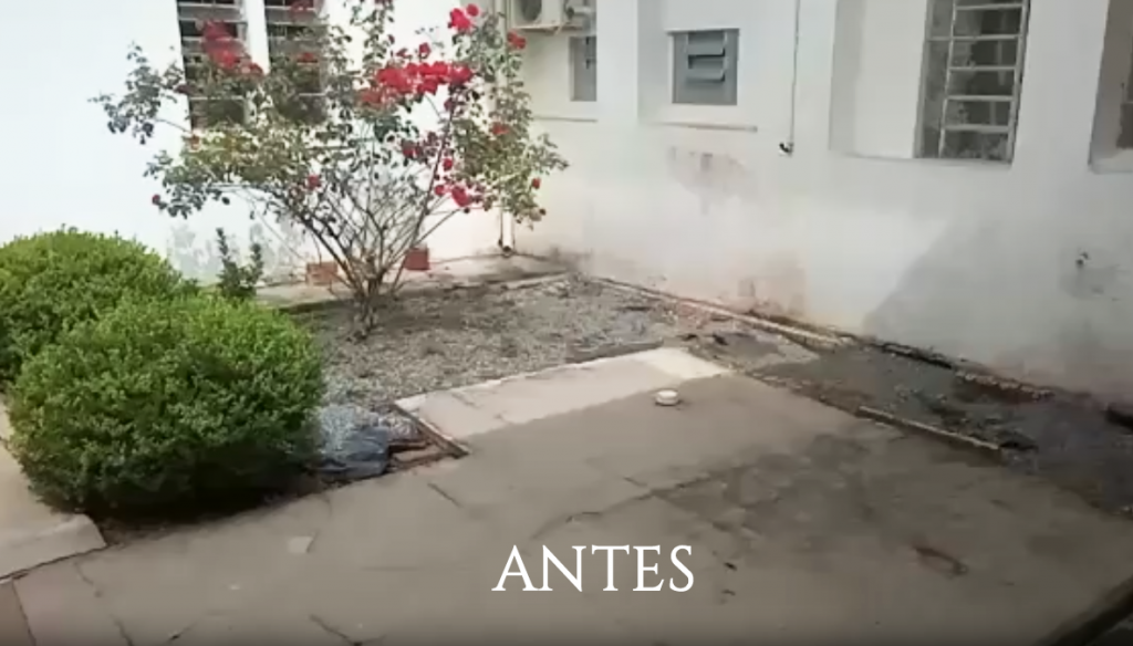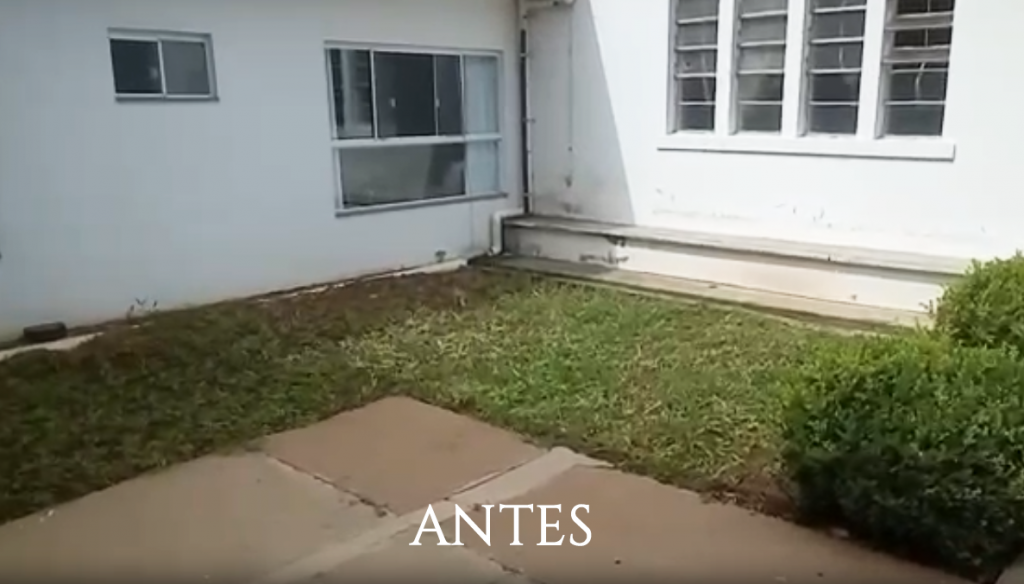 Além do cuidado com a grama e plantas, o local recebeu cobertura do piso, pedras decorativas, pintura nas paredes e janelas e colocação de bancos. Veja o antes e depois do espaço revitalizado.