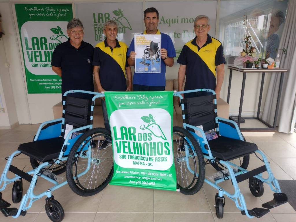 O Rotary Club de Mafra no dia 15/02/2024 fez a entrega de 04 cadeiras de rodas recebidas do projeto "Mobilidade para Todos", programa criado dentro do Distrito 4630 de Rotary Internacional em parceria com a Free Wheelchair Mission. Foram duas as entidades beneficiadas: GIRO - Grupo Interação Riomafrense de Oncologia e Lar dos Velhinhos São Francisco de Assis.