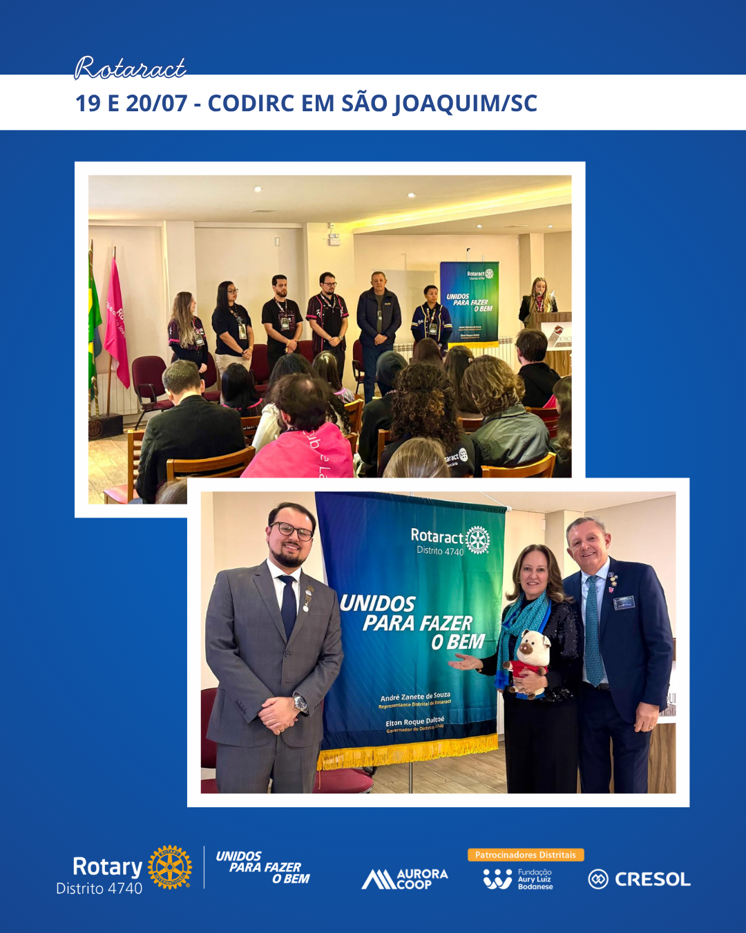 19 e 20/07 – Participação na CODIRC, evento distrital do Rotaract, com a posse do novo Representante Distrital de Rotaract (RDR), André Zanete de Souza, em São Joaquim.