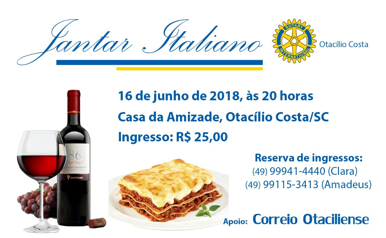 Rotary Club de Otacílio Costa promove jantar italiano na noite de sábado, 16 de junho.