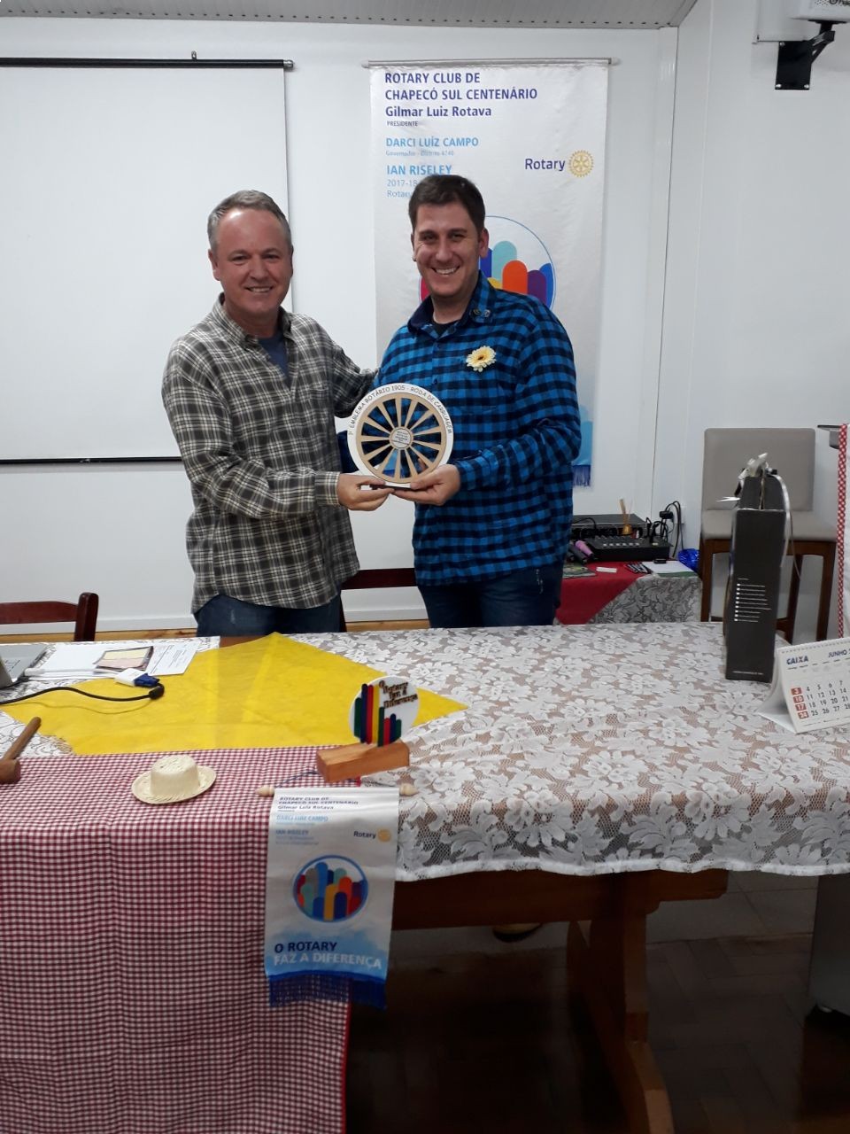 Na última segunda-feira, a reunião semanal do Rotary Club Chapecó Sul Centenário teve visita especial. Companheiros do Rotary Clube de Ipuaçu realizaram a visita de companheirismo e trouxeram a Roda Rotária. A reunião teve clima festivo em função da proximidade da data de São João. Foi uma noite caipira, com comidas típias e uma pauta recheada de atividades.