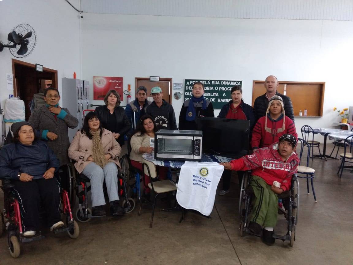Os Companheiros do Rotary Club de Chapeco Sul Centenário, realizaram a entrega de um forno elétrico e uma TV para a FCD- Fraternidade Cristã Pessoa com Deficiência Chapecó.