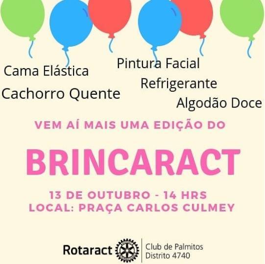 O Rotaract Club de Palmitos proporciona momentos de descontração e alegria para as crianças do município em comemoração ao dia das crianças, comemorado no dia 12 de outubro. Neste sábado, dia 13 de outubro, acontece mais uma edição do Brincaract na Praça Carlos Culmey, das 14h às 18h.