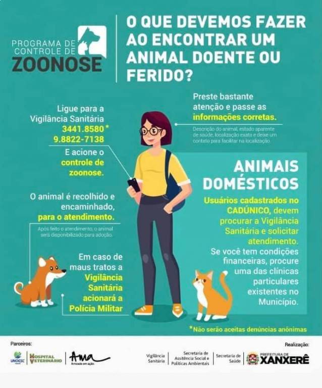 Na cidade de Xanxere, a vigilância sanitária, Prefeitura contam com um sistema caso encontre um animal ferido ou doente, siga as instruções da foto. E um Disk Denúncia da Policia Civil existe também para acionar em casos maus tratos.