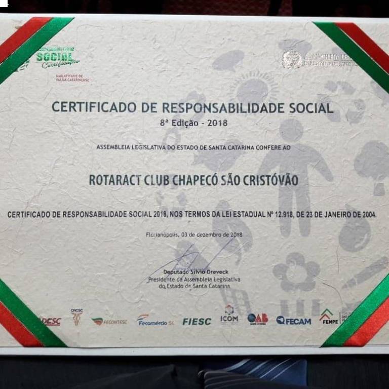 Nosso clube, na última segunda feira, teve a honra de receber o certificado de Responsabilidade Social de Santa Catarina pela ALESC.
