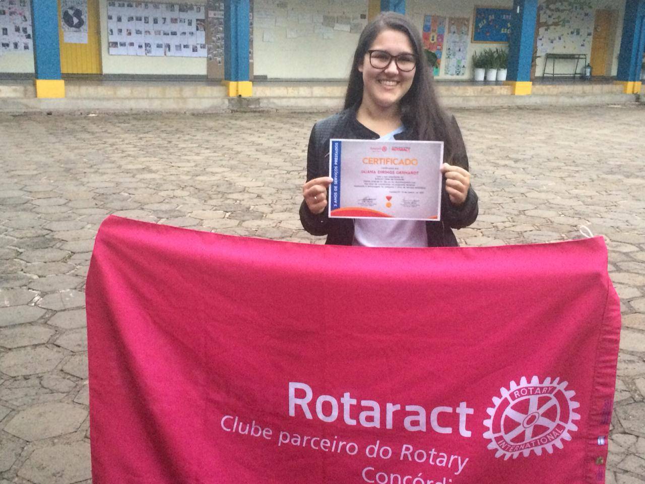 Durante a reunião do dia 07/04 a companheira Jaiana Gerhardt recebeu seu certificado de recohecimento de três anos de serviços a comunidade pelo Rotaract Club de Concórdia, enrtegue pelo Representante Distrital durante o JARC em Lages!! Parabéns Jaiana, seus serviços são de grande importância para a comunidade, e para um mundo melhor!!
