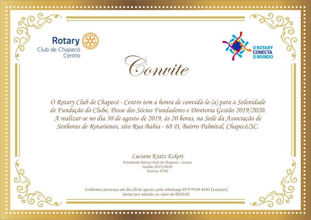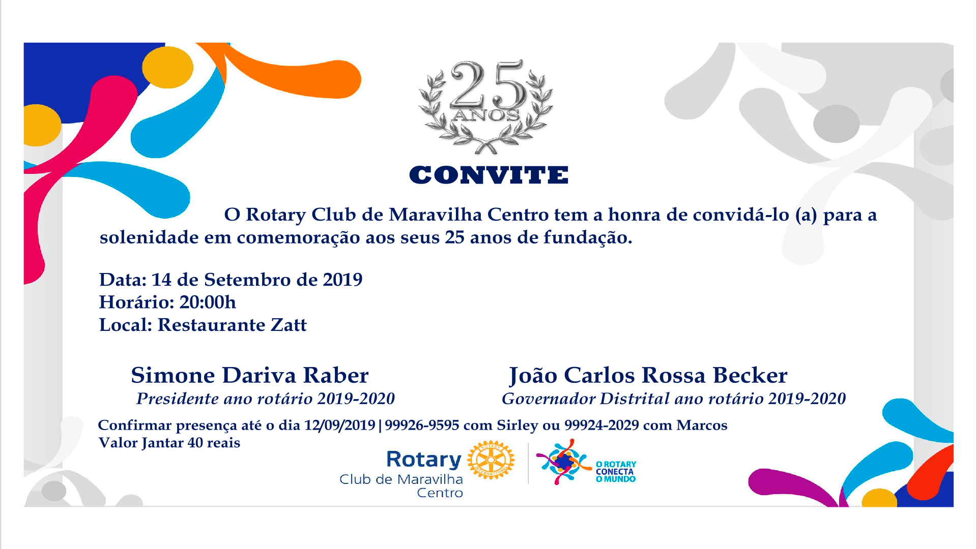 No dia 14 de setembro, às 20h no Restaurante Zatt, o Rotary Club de Maravilha realizará uma festiva em comemoração aos 25 anos de fundação do clube.